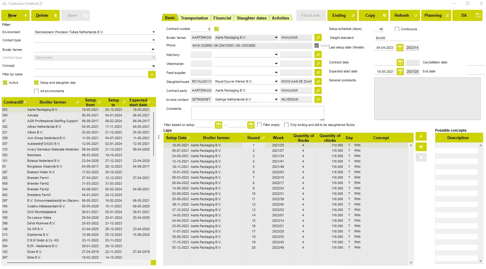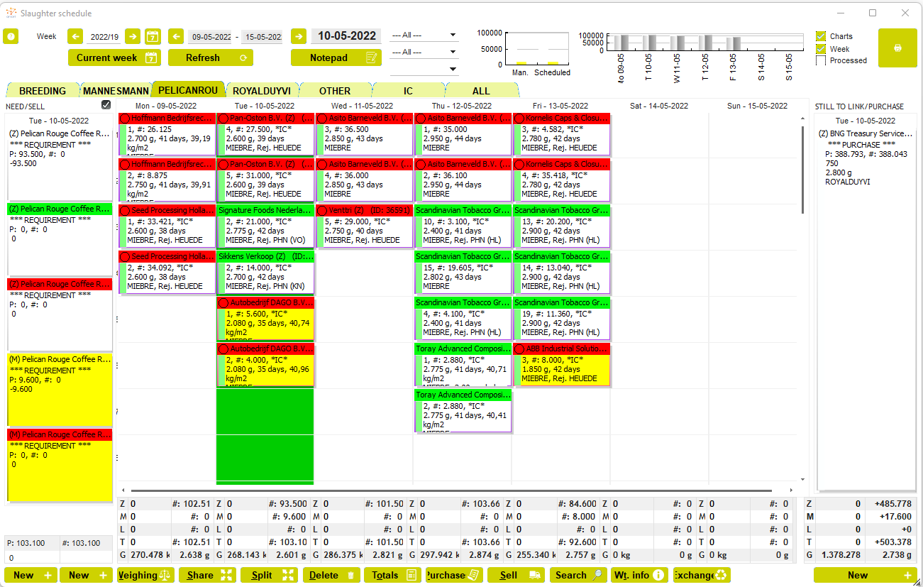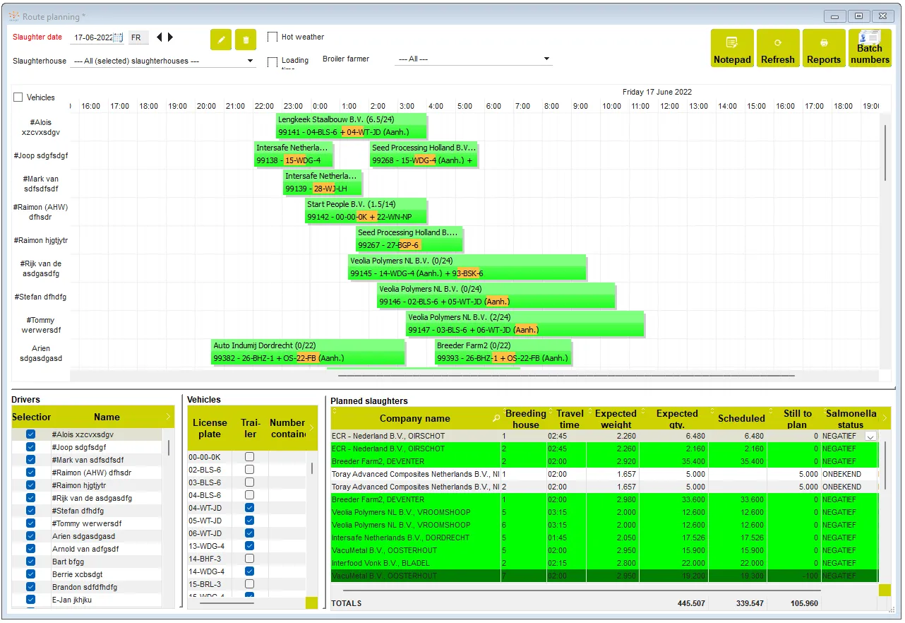 PoultryPlan optimizes the value in the slaughterhouse by planning and managing the poultry chain. PoultryPlan aims to manage the business processes of the purchase and sale of broilers, as well as the long-term and daily schedules. The software also simplifies the process of creating trip schedules and it allows you to register all kinds of data about living and slaughtered flocks. The slaughter overviews, right up to the invoicing of deliveries, can be managed with PoultryPlan. Apart from offering a more efficient process, the software registers a lot of data that can be turned into reports and analyses.